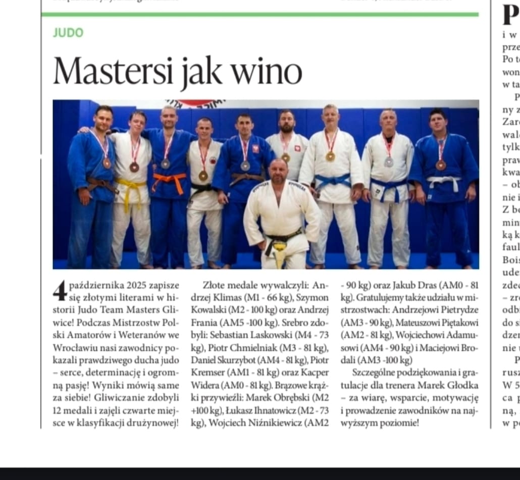 4 października 2025 zapisze się złotymi literami w historii Judo Team Masters Gliwice! Podczas Mistrzostw Polski Amatorów i Weteranów we Wrocławiu nasi zawodnicy pokazali prawdziwego ducha judo - serce, determinację i ogromną pasję! Wyniki mówią same za siebie! Gliwiczanie zdobyli 12 medali i zajęli czwarte miejsce w klasyfikacji drużynowej!
